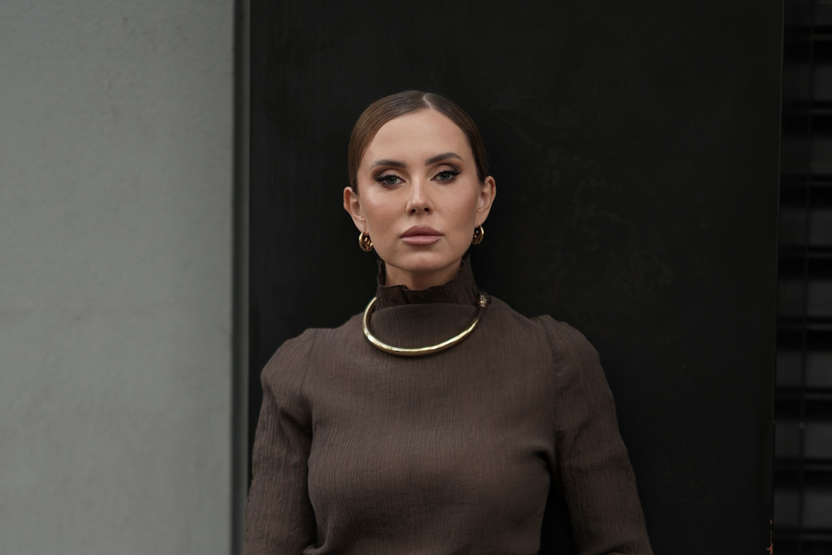 Образ представляет собой монохромный ансамбль в оттенках теплого какао, что само по себе является акцентом. Костюм, состоящий из блузы и юбки облегающего кроя, дополнен замшевыми туфлями, сумкой и колготками в монограмме, а также колье с металлическим элементом.