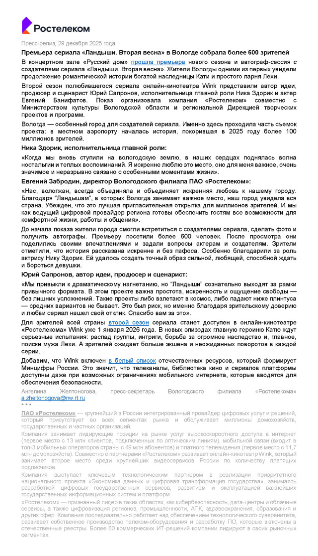 «Нас, вологжан, всегда объединяла и объединяет искренняя любовь к нашему городу. Благодаря «Ландышам», в которых Вологда занимает важное место, наш город увидела вся страна. Убежден, что это лучшая пригласительная открытка для миллионов зрителей. И мы как ведущий цифровой провайдер региона готовы обеспечить гостям все возможности для комфортной жизни, работы и общения».