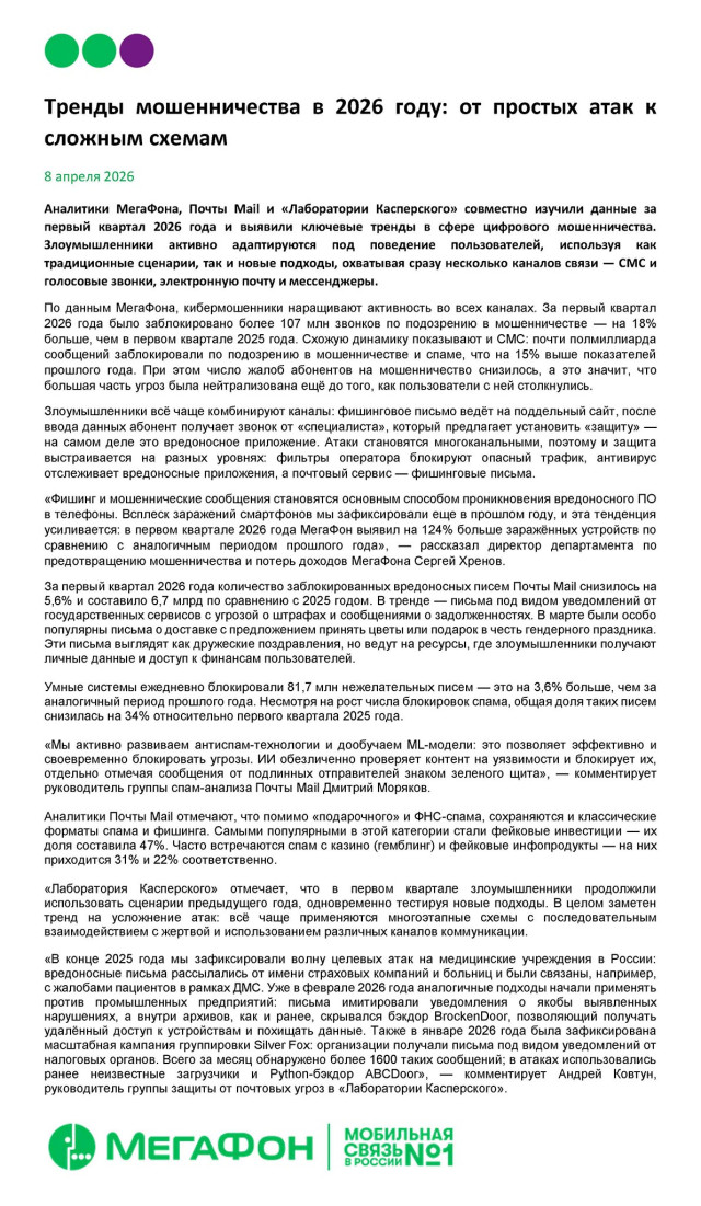 «Фишинг и мошеннические сообщения становятся основным способом проникновения вредоносного ПО в телефоны. Всплеск заражений смартфонов мы зафиксировали еще в прошлом году, и эта тенденция усиливается: в первом квартале 2026 года МегаФон выявил на 124% больше зараженных устройств по сравнению с аналогичным периодом прошлого года», — рассказал директор департамента по предотвращению мошенничества и потерь доходов МегаФона Сергей Хренов.